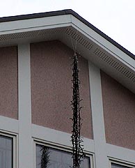 もともとは、リビング南側のベランダにイルミネーションを付けようと思って、いろいろ考えていたのですが、その作業には「はしご」に登っての作業が必要でした。しかし、ステンドにライトイルミネーションを付けるのにはしごを使用したのですが、これがとってもこわかった。そこで、はしごを使わないで済む方法を考えました(まだ死にたくないですから・・・せめてあと10年くらいはこの家に住みたいなぁ〜(笑))。何点か心配はあったんですが、「この方法ならいけるかな?」と考えたこと・・・それは釣り糸で屋根からつり下げるという方法。といっても屋根にはどこにも糸を引っ掛けるところはないので・・・