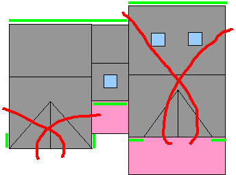 それならば!ということでとりあえずやってみましょう、大遠投大会!目標は図の赤線コースです。とりあえずはリビング側です。緑の線は樋なのでここは避けなければなりません。