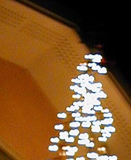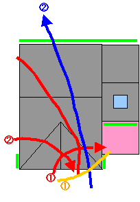 今日は向かって左側(西側)のイルミネーション設置しました。まず、例のごとく遠投大会。目標は図の@Aを設定し、矢印の方向に向けて投球開始。しか〜し!なかなか思ったコースにボールが飛んでくれません。そこでAについては無理と判断し裏の空き地を利用して簡単に投げられるAのコースに投げてあとでワンちゃんの横まで誘導しました。@については何回か投げているうちになんとか成功。そこでそれぞれの釣り糸に、2本ずつに束ねた釣り糸を結びつけて、テンションをかけながら引っ張ります。こうしてそれぞれ2本ずつの釣り糸に置き換えたあとに、いよいよ本番のつり上げです。今回はここで失敗しました。というのは双方の糸を交互に少しずつつり上げていくのですが、つり上げているときに@のルートが少したわんだ際に@のようにはねてしまったのです。しかし「リビング側は4セットを釣り糸4本でつり上げているから、こちらは3セットだから3本で同じ条件」と考えてそのままつり上げを続行しているうちに@のルートの残りの1本が切れてしまいました。この時点ですでにあたりは薄暗くなってきていたので、悩んだ末に残り2本でつり上げることに・・・