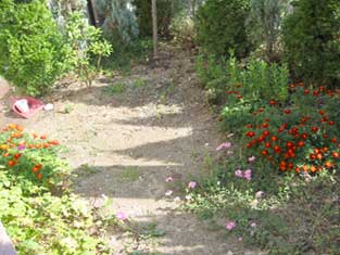2002年10月9日時点の庭部分の状況です。以前に鉢植えで置いてあったものの種とか球根が自然と繁殖して、まるで雑草のごとくに咲いています。 | |||