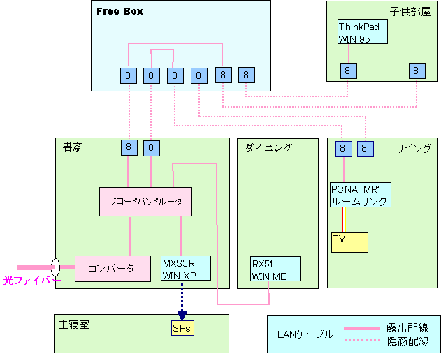 現在の書斎のVAIOの使い方としては、 ・オーディオとして(FM、MD・CDをVAIOに取り込んで)---BGM、FMの留守録、目覚まし代わり 実は、有線放送を引く予定だったのですが、有線会社の都合で、有線引けてません。もちろん配線はしてあり、また寝室とダイニングにはスピーカーも設置されているのですが(これらは有線会社の都合で引けなくなったため無料で設置されてます)、そこで、遊んでいた寝室のスピーカーのケーブルを書斎のコンセントから引き出して、VAIOに接続。これで、タイマーをセットすれば自分の好きな曲を聴きながら目ざめることができます、と言っても目覚まし時計も必要ですが・・・) ・テレビを見る(留守録) ただ、テレビ番組を録画するだけなのですが、これが結構便利です。テレビプログラムのサイトで、見たい番組の予約ボタンを押すだけ。空きテープを探したり、録画したテープを探したりする手間が省けるものとっても楽です。 ・ネットワークサーバーとして VAIOにはMedia barというのがあって、これを各パソコンにインストールしておくと、別のパソコンから別のパソコンにため込んだ映像・音楽・写真を見ることができるというもの。SONYは、XPに限ってサポートしているので、拙宅はサポートの対象にはなりませんが、試しにやってみました。理由はわかりませんが、テレビ録画した映像はダイニングのVAIOから呼び出すことができますが、音楽・写真に関しては、書斎のサーバーとしてのVAIOを認識してくれません。まあ、写真はもともとviewerとしてVIXを使っているのでこれができなくても別のパソコンにため込んだ写真は見れるんですけどね。 ・もちろん通常のパソコンとして 今後の活用方法としては、 ・さらなるネットワークサーバーとして 11月に「ルームリンク(ネットワークメディアレシーバーPCNA-MR1)」という製品が発売されます。これは、リビングなどのテレビに接続することで、リビングから別室のVAIOを操作でき、別室のVAIOにため込んだ映像・音楽・画像をテレビで見たり聞いたりできるというもの。せっかくリビングにもLANケーブルが配線してあるので、これを採用してみようと思っています。