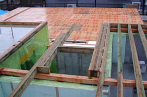 - の後、上棟となるようです。上棟後、外壁部の防水工事を行って断熱材の充填へとすすみます。通常は工場にてパネルを製造して搬入するので、現場での作業は早く進むそうです。しかしスキップフロアの場合、パネルは工場対応できないものもあるためそのぶんについては現場での手作業で行われるため、通常より工期が長くなるようです。う〜ん、複雑な心境ですね。手作業というのもちょっと心配です。