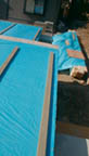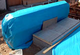 3日前と比べて変わったことといえば、リビングダイニングの部分に床断熱材が入れられて、その上にベニヤ合板が張られていること、すべての床合板の上に薄いビニールが糊付けされていること、土台の角材の周囲にも合板が張られていること、くらいでしょうか。あと広縁南側の庭になるところに、山積みされている2×4の木材がシートをかぶせられておいてあります。よく見ると至る所