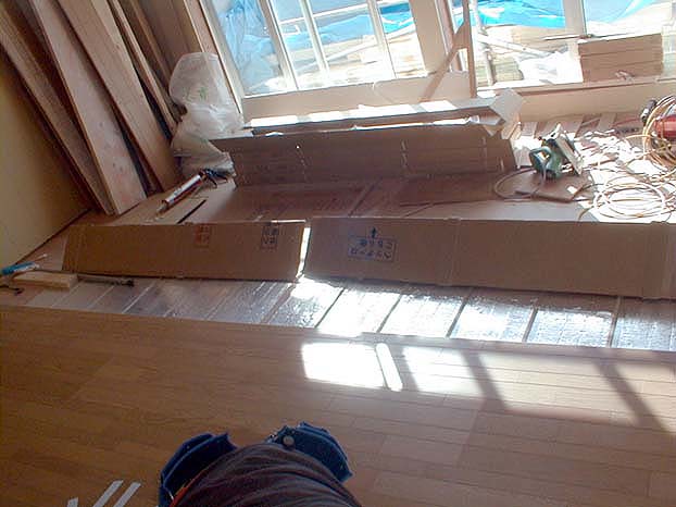 室内では、たくさんの方が作業をしておられ、なんか非常にごちゃごちゃしていて活気がありました。玄関ホールのフローリングはまさに貼られた直後で養生カバーが貼られており、リビングのフローリングも貼られている最中でした。知らない大工さん?によってこれらの作業は行われていました。助っ人さん? ダイニングにはシステムキッチンが搬入され、サンウェーブさんが設置工事をされていました。