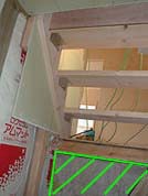 右写真は玄関ホールからLDKに上がる階段部分です。斜線部分はまだ断熱材が貼られていませんが、これから貼られるんだと思います。