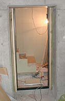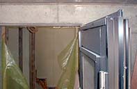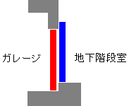 地下室ではドア枠が設置されていました。右(上)の写真のように、結局1段上がったところに設置されていました。図解すると左の図のようになります。赤い部分に設置すると地下階段室側には開けることができないので青い部分に設置されてありました。これで内開きは可能になりますが、「ドア開けると上の10cmほどにはコンクリートが顔を出す」ということになります。これはちょっとぶっさいく〜・・・ですが仕方ありませんか。