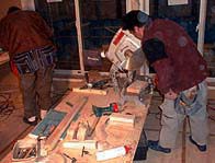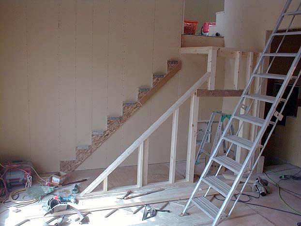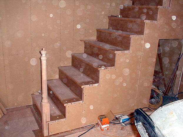 リビングルームの中央には大きな作業台が設けられ、階段手摺を作っておられました。この手摺はステンドグラスと並んで我が家の一番の見せ場となる予定です。三井ホームのカタログの中でMKXというのを選びました。上にはもっと上の高価なものはいくらもあったのですが、これでも我が家では奮発した部分です。大まかな形は作られてあるようですが、磨いたり、色を付けたりというのは現場での作業となるようです。