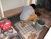 玄関ではタイル工事が行われていました。きれいにタイルが並べられ、その間のモルタル(?)を塗っているところでした。この部分でかねてからの懸案であった「土間立ち上がり部分の断熱材」についてですが、まだタイルが立ち並んでいる状態でタイルの奥数センチのところに白いものが見えたので「これが断熱材か!」と思って工事の人に聞いたところ、「これは基礎のコンクリートが見えていますね」とのことでした。監督さんは断熱材入れてくれると言っておられたのに・・・。