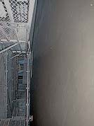 仕上げは右の写真のようになります。このモルタルは樹脂混合モルタルで、クラックの入り難いもののようですが、左官屋さんによると混合比は「ようわからへんけどほとんど樹脂とちゃうか」と言っておられました。