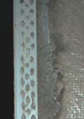 コーナー部分(ここはモルタルが未塗装)、土台水切部分、軒下防火板部分は下の写真のような感じです。モルタルが塗られないセメントボードの辺縁にはたくさん穴の開いたプレートが装着されています。また防火板の下に空いていた隙間は消滅しました。