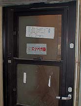 どういうことかというと、左写真のように、ドアはコンクリート開口部分とほとんど同じ高さです。ドアは内開きに設置される予定なのですが、右写真のようにコンクリート開口部の足下には10cm程度の段差があるため、ドアはぴったり設置されたとしても内側に開くことはできません。しかも鍵は玄関ドアと同じものに付け替えていただくことになっていたのですが、なんとピッキング被害の多発しているディスクシリンダータイプが付いているではありませんか?!