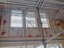 室内造作工事は、リビング階段が概ね完成し、リビングに室内足場が設置されていました。右の写真のようにリビング南面上部の石膏ボードはまだ貼られていませんでしたが、おそらくこの足場の設置待ちだったのでしょう。