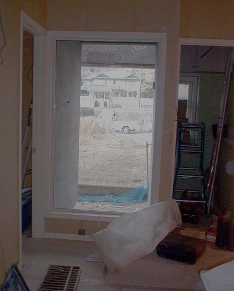 そして大きな問題点を発見してしまいました。いつも遠目に見ていたので、半地下室の勝手口ドアが搬入されているのは知っていたのですが、間近で観察したのは今日が初めてだったのです。ドアには「枠待ち」のメモが貼られていました。