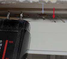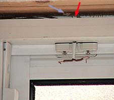 湿度計の上奥に茶色く見えているのが、セコムセンサーのコードです。 何やら、疑わしいキズが2カ所あります。一つはマグサに(灰色矢印)、そしてもう一つはサッシに(赤矢印)。 なんか、ココが怪しいのですが、雨漏りをしている現場をとらえるために、水かけを行いました。