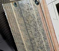 ちょうど雨漏りしていた部分の裏側が、このようになっていました。 「おぉ! カビはえてるやないけ〜!!」 と思ったのですが、これはこういった木材であるとのこと、実際に湿度を測定してもらうと湿度9%、これ以上ないくらい乾燥していました、ホッと一安心。さて次にセンサーコードの上部を視認すると・・・