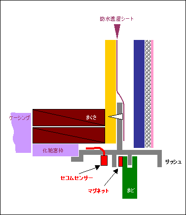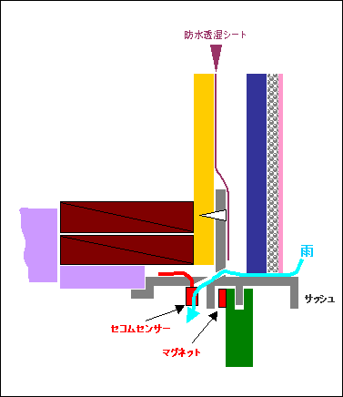 結局、本日の結論は、セコムセンサー取り付け作業の時に、ドリルでサッシュを貫通してしまい、そこから雨が入ってきて、センサーのコードをつたって、ピンポイントで漏っていたのではないか? ということになりました。実際、このサッシュに開けられた穴にドライバーを突っ込むと通気層まで突き刺さり、抜いたドライバーには水滴がついていました。