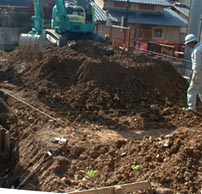 今日は祝日ですが、現場では3人の職人さんが仕事をしておられました。進行中の工事は1階部分の土掘りで、余った土はトラックで運び出していました。昨日までに地下室北側部分の割栗石設置、突き固めが終了しているようで、近々捨てコンが打たれるようです。理由はよくわかりませんが(高基礎のせいでしょうか?)、この部分は布基礎、1階部分はベタ基礎になるようです。日程は少しずつずれ込んでおり、基礎工事の終了は12月8−9のあたりでしょうか。