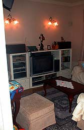 AV機器は概ね以前からのものを持ってきています。スピーカーの置き場に困ってしまい、結局ラックの上に寝かしてあります。しかしもともと調子の悪かったテレビがいよいよ使い物にならなくなり、新調してしまいました。そのときテレビと一緒に陳列されていたミニシアターセット(¥28000)も購入しちゃいました。さらにスカパーに加入するとさらに¥5000キャッシュバックしてもらえるとのことで、加入。もちろんチューナーとアンテナは無料です。リアスピーカーは後ろに設置するところがないので両サイドに設置しました。既存のオーディオシステムと、新規のミニシアターシステムの融合については検討中ですので近々アップしたいと思っておりますが・・・