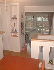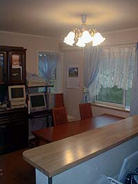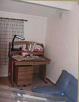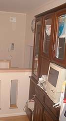 地下からの階段のために4.5畳になってしまいましたが何とか収まっています。家具は以前使っていた食器棚を置いていますが、食器は置いていません。以前電子レンジ置き場だったこの食器棚の中程にはマックのパソコンが座っています。これは予定外なのですが、今まで使っていた「マックでもウィンドウズでもOK」の子供用お遊びCD-ROMがVAIOでは使えないためです。
